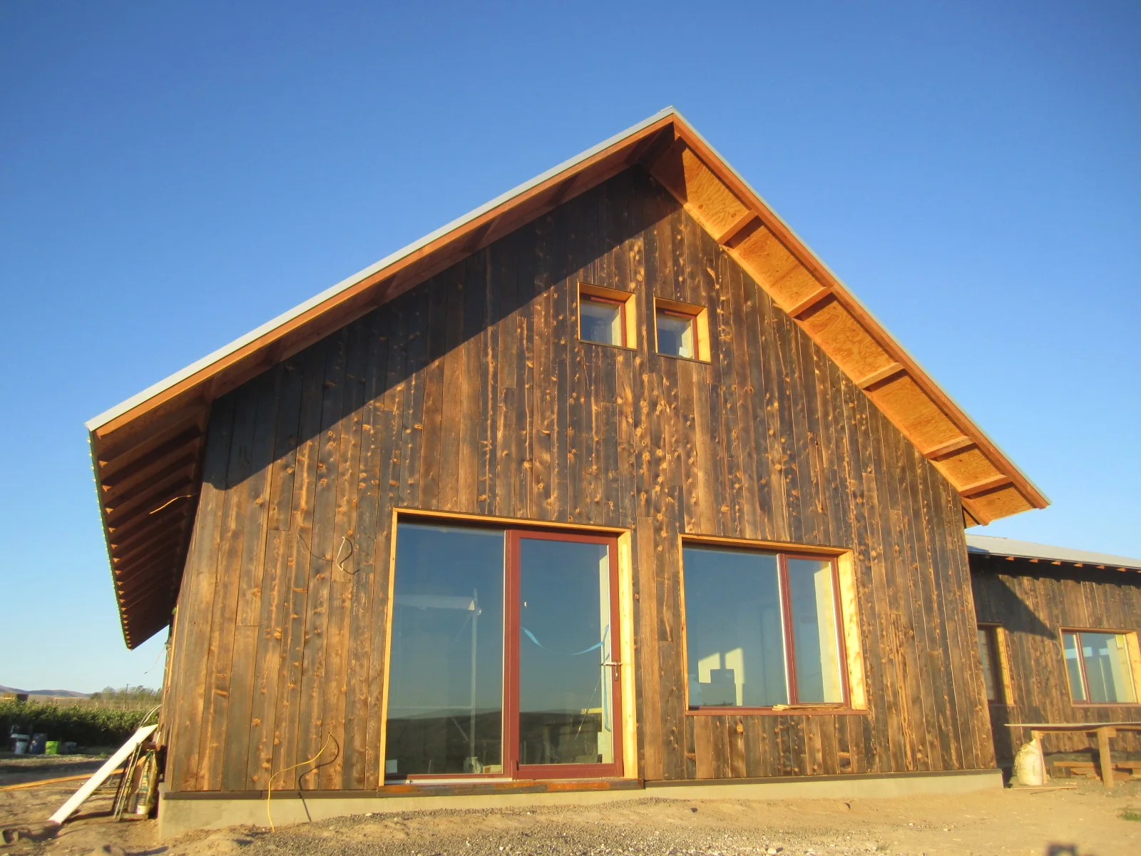 Natural materials are employed throughout, featuring stained concrete floors, clay plaster walls, and exposed wood roof rafters.  The exterior siding is flame blackened (shou sugi ban technique) to protect it without the need for painting.